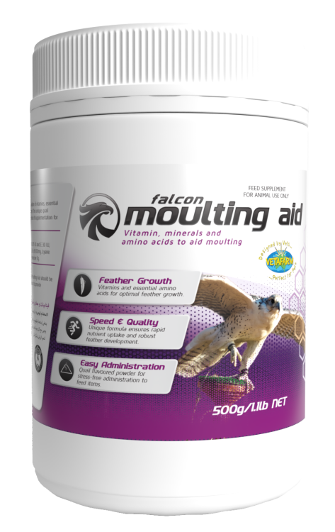 A quail flavoured vitamin, trace mineral and amino acid supplement to aid moulting in falcons. The moulting falcon requires extra vitamins, minerals and amino acids for feather growth, the actives in Moulting Aid will support this new feather growth so that the falcon will moult faster, grow healthier feathers and experience less stress. The proteinated minerals have been formulated to make them easily absorbed from the gut.